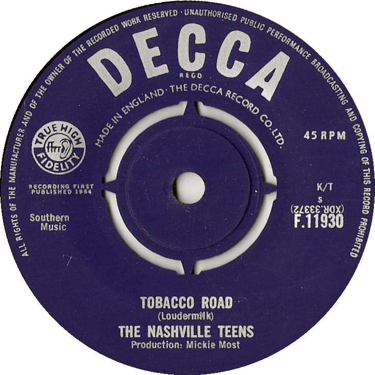 Soon-to-be super-producer Mickie Most caught the group and took them into the studio in the spring of 1964 to record their first single. One of the guys had heard an import of John D. Loudermilk’s “Tobacco Road” and thought it would sound good with a full band arrangement. Loudermilk’s folky country song told of growing up poor in North Carolina — not exactly a setting the Nashville Teens were acquainted with — but the band electrified the track, giving it an edge of defiance and menace which rocked much harder than anything else on the pop charts in the early 60’s, paving the way for the tougher sounds of The Animals, The Rolling Stones, and a host of American garage bands.